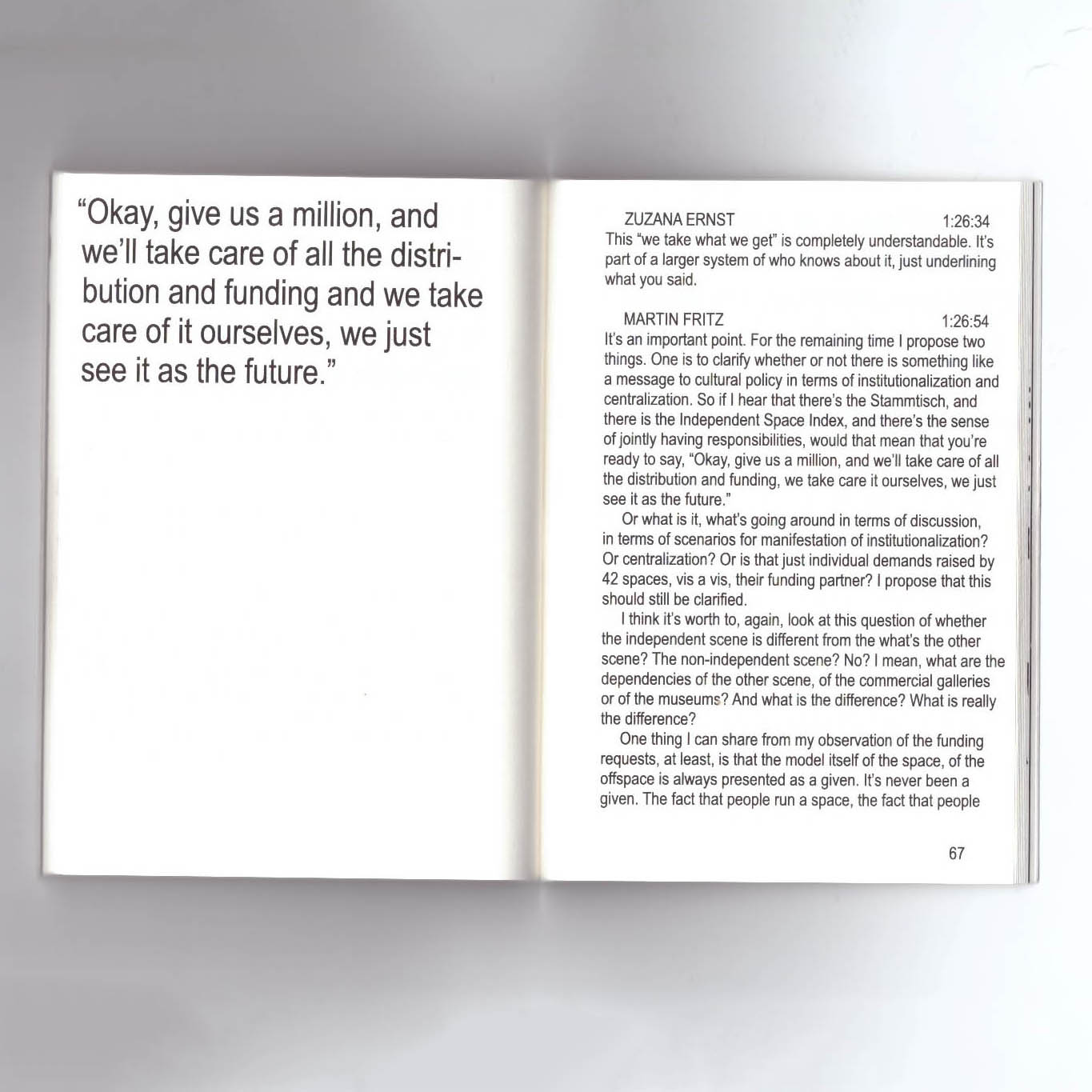 This is the edited transcript of a panel discussion organised by Francis Ruyter that took place on 22 June 2022 at Neuer Kunstverein Wien, in the framework of Independent Space Index festival, between Zuzana Ernst, Martin Fritz (Moderation), Katharina Höglinger, Bruno Mokross, Michael Part, Matthias Sohr, Vincent Weisl and Luisa Ziaja.
